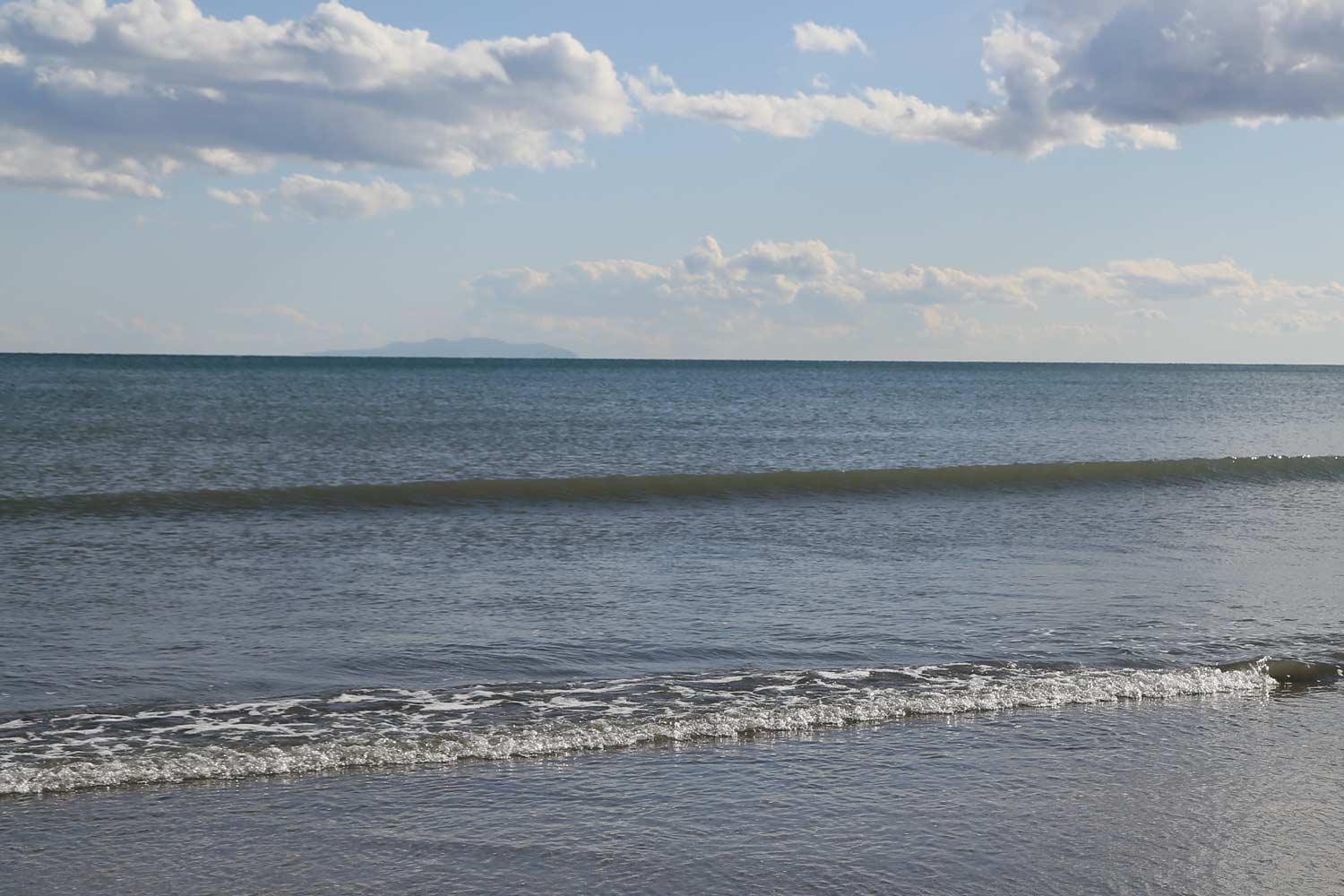 例年にくらべてずっと人気(ひとけ)の少ない2020年の由比ヶ浜。砂浜に座って海を眺めていると、水平線の向こうに大島が見えた。ぼーっと見ていると、それが「ここから動けない自分」にとって「存在は知っていても手の届かないもの」の象徴のように思えてきた。それはまた、「欧州にいるHiruko」と「戻れない祖国」とどこか繋がるような気もした。